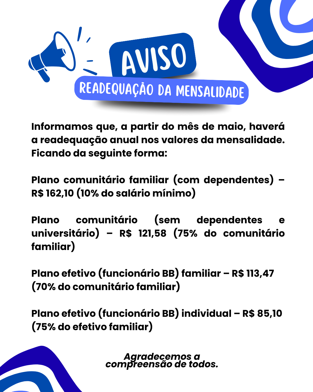 Com base no salário mínimo atual (R$ 1.621,00), as mensalidades passam a vigorar, a partir de 1º de maio, da seguinte forma: