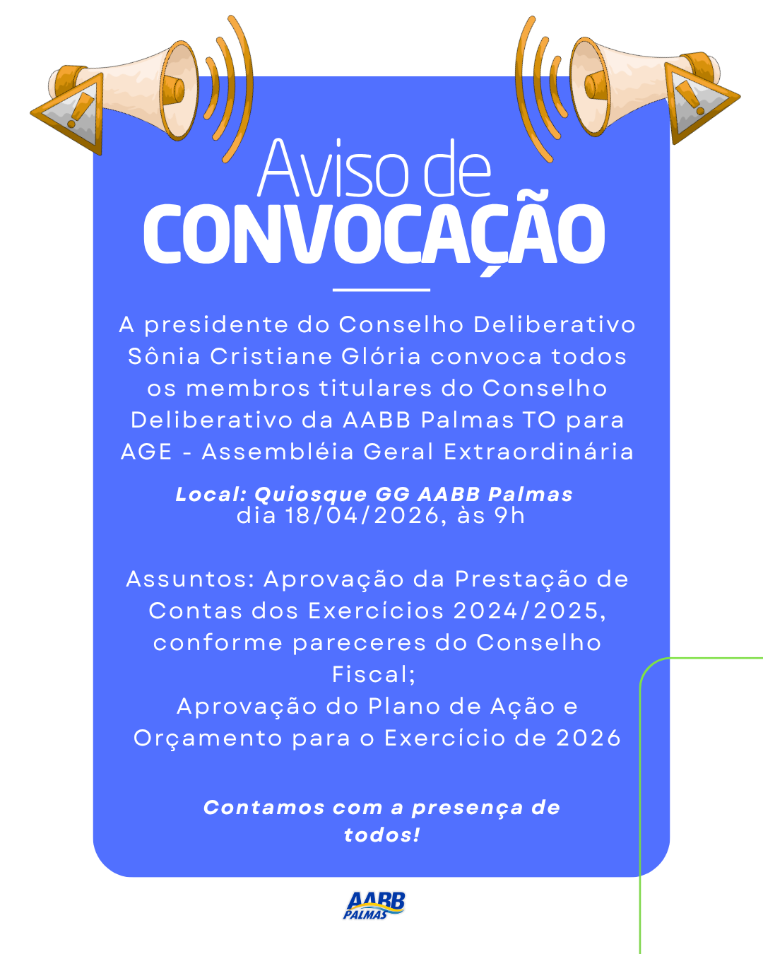 A presidente do Conselho Deliberativo, Sônia Cristiane Glória, convocou através de Edital (link) todos os associados titulares da AABB Palmas para participarem da Assembleia Geral Extraordinária (AGE), que será realizada neste sábado, dia 18 de abril de 2026, às 9h, no quiosque GG.