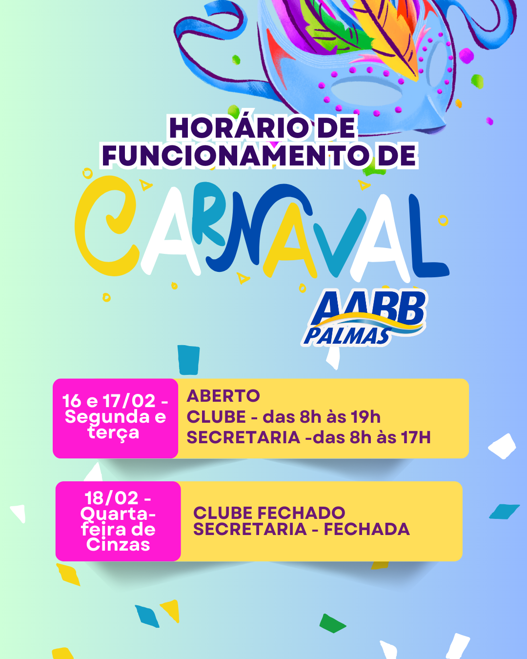 A Diretoria da AABB Palmas divulga o funcionamento do clube para o Carnaval 2026. Assim como em outros anos, o clube abrirá normalmente na segunda e terça de Carnaval, dias 16 e 17 de fevereiro, com horário de feriado, ou seja, das 8h às 19h clube e das 08 às 17h secretaria. Na quarta-feira de Cinzas, dia 18 de fevereiro, tudo estará fechado para manutenção dos quiosques e piscinas, e descanso dos funcionários.