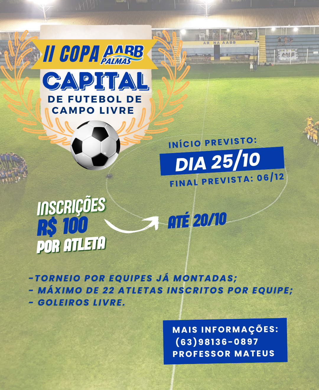 O período de inscrições seguirá até 20 de outubro de 2025. A taxa é de R$ 100 por atleta e as equipes terão no máximo de 22 atletas. Já os goleiros serão livres (sem limite de número). O Torneio será por equipes já montadas. Para inscrições e dúvidas, entre em contato com o Prof. Mateus pelo telefone (63) 98136-0897.