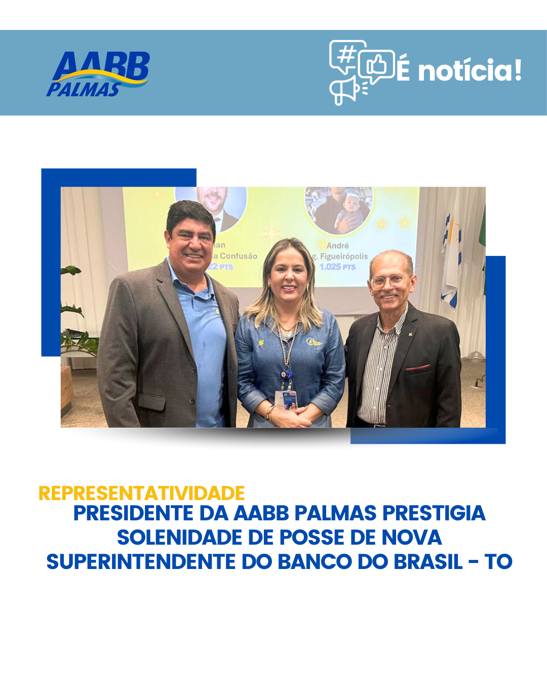 O presidente da AABB Palmas, Pedro Carvalho, prestigiou na noite desta terça-feira, dia 27 de janeiro, a cerimônia de posse da nova superintendente do Banco do Brasil no Tocantins, Juliana Campos de Castro Arantes, reforçando a presença da AABB em momentos importantes da vida institucional do estado. O evento reuniu autoridades, dirigentes e representantes de diversas entidades, no auditório do Banco do Brasil, Agência 1867, em Palmas.