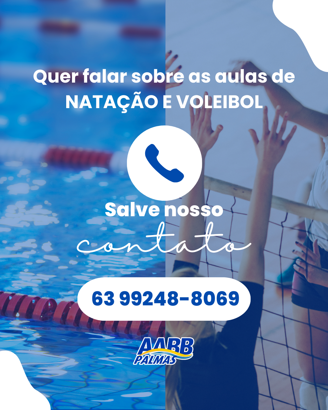 Entre em contato pelo novo telefone 63 99248-8069 e venha fazer parte das aulas de Natação e Vôlei na AABB Palmas.