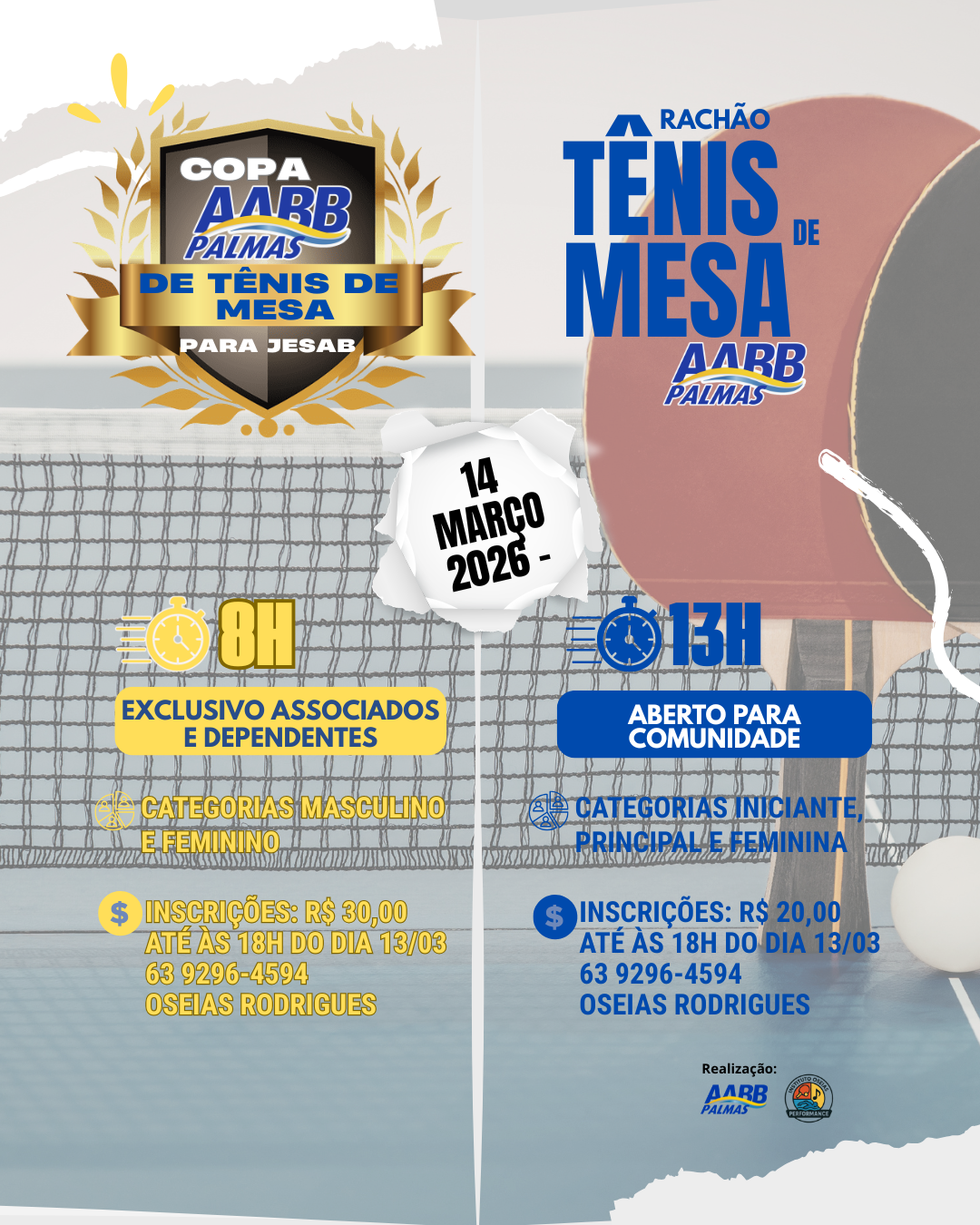 No próximo dia 14, a AABB Palmas será palco de muita disputa, técnica e integração com a realização da Copa AABB Palmas de Tênis de Mesa – Classificatória para a JESAB e Rachão de Tênis de Mesa Aberto à Comunidade. As inscrições devem ser realizadas até às 18h do dia 13 de março, sexta-feira, com o professor Oseias Rodrigues pelo 63 99296-4594. A taxa para participar da Copa é de R$ 30 por atleta e para o Rachão R$ 20.
